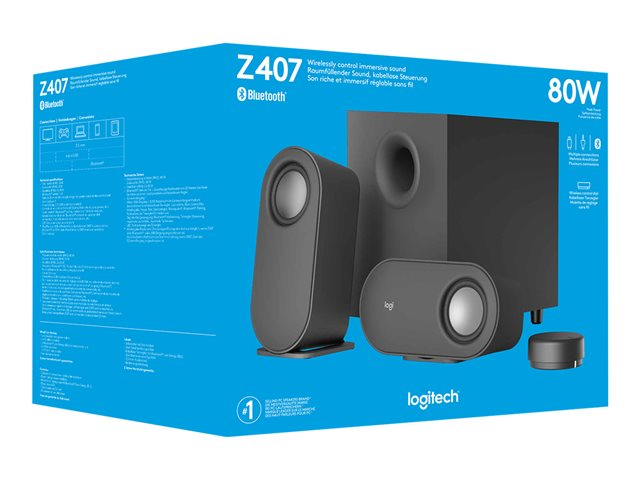 Produktbeskrivning Logitech Z407 - Android Edition - högtalarsystem - för persondator - trådlös Typ av produkt Högtalarsystem - för persondator - 2.1-kanals Systemkomponenter 2 högtalare, bashögtalare Högtalartyp Aktiv Nominell uteffekt (total) 40 Watt Toppström för ljudsystem (totalt) 80 Watt Frekvensrespons 40 - 20000 Hz Förstärkare Integrerad Gränssnitt Bluetooth Specifikationer för högtalarsystem 2 x satellithögtalare 10 Watt 8 ohm
