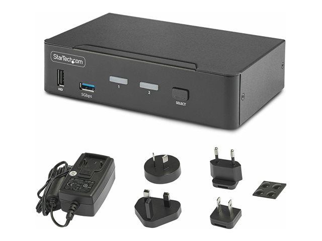 Produktbeskrivning StarTech.com 2-Port DisplayPort KVM Switch, 8K 60Hz / 4K 144Hz, Single Display, DP 1.4, 2x USB 3.0 Ports, 4x USB 2.0 HID Ports, Push-Button & Hotkey Switching, TAA Compliant - OS Independent, Metal Housing (D86A2-2-PORT-8K-KVM) - omkopplare för tangentbord/video/mus/ljud/USB - 2 portar - TAA-kompatibel Typ av enhet Omkopplare för tangentbord/video/mus/ljud/USB - 2 portar Undertyp KVM Portar 2 x KVM/ljud/USB Antal KVM-användare 1 lokal användare Prestanda Dataöverföringshastighet: 5 Gbit/s Funktioner Snabbknappar, tryckknapp Strömtillförsel AC 100-240 V 1 A Dimensioner (BxDxH) 16 cm x 10 cm x 4 cm Vikt 600 g Färg Svart TAA-kompatibel Ja Tillverkarens garanti 2 års garanti -