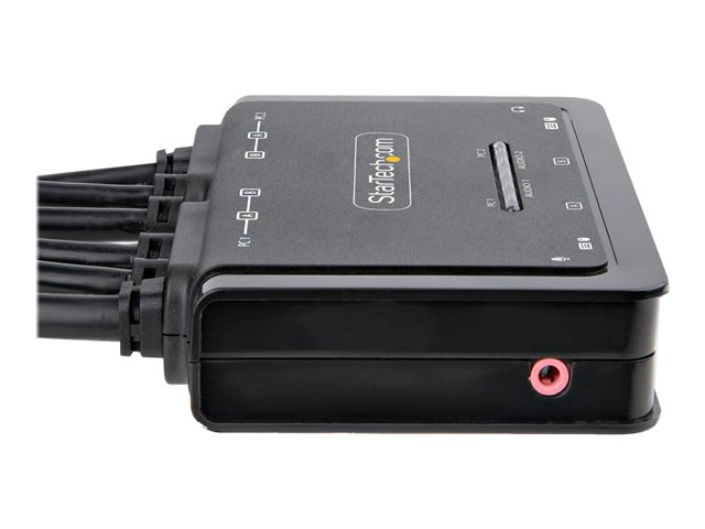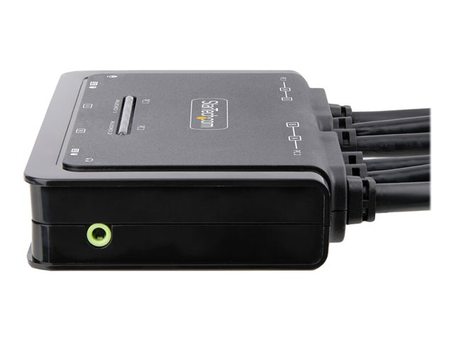 Produktbeskrivning StarTech.com 2-Port Dual-Monitor DisplayPort Cable KVM Switch, 4K 60Hz, Compact KVM with 5ft/1.5m USB-A/DisplayPort/Audio Integrated Cables, Bus Powered - Remote Push Button/Hotkey Switching (C2-DD46-UA2-CBL-KVM) - omkopplare för tangentbord/video/mus/ljud/USB - kompakt - 2 portar Typ av enhet Omkopplare för tangentbord/video/mus/ljud/USB - 2 portar Undertyp KVM Portar 2 x KVM/ljud/USB Antal KVM-användare 1 lokal användare Funktioner Fjärromkopplare, stöd för 2,1 ljudkanal, ABS-hus, bussdriven Standarder som följs USB 2.0 Dimensioner (BxDxH) 9 cm x 12.5 cm x 2.5 cm Vikt 600 g Färg Svart Systemkrav Microsoft Windows 7 / 8 / 8.1 / 10 / 11, Apple macOS 10.12 - 10.15, Apple macOS 11.0, Apple macOS 12.0, Google Chrome OS, Linux Tillverkarens garanti 2 års garanti -