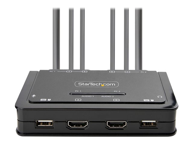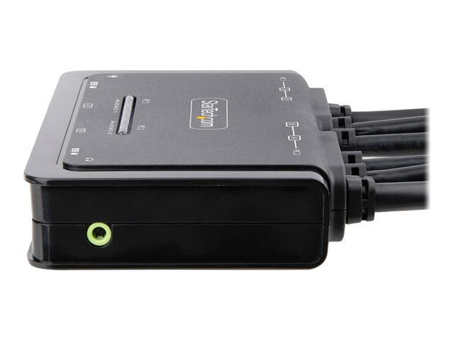 Produktbeskrivning StarTech.com 2-Port Dual-Monitor HDMI Cable KVM Switch, 4K 60Hz, Compact KVM with 5ft/1.5m USB-A/HDMI/Audio Integrated Cables, Bus Powered - Remote Push Button/Hotkey Switching (C2-DH46-UA2-CBL-KVM) - omkopplare för tangentbord/video/mus/ljud/USB - kompakt - 2 portar Typ av enhet Omkopplare för tangentbord/video/mus/ljud/USB - 2 portar Undertyp KVM Portar 2 x KVM/ljud/USB Antal KVM-användare 1 lokal användare Funktioner Fjärromkopplare, stöd för 2,1 ljudkanal, drivs via USB, ABS-hus Standarder som följs USB 2.0 Dimensioner (BxDxH) 12.7 cm x 8.3 cm x 2.6 cm Vikt 600 g Färg Svart Systemkrav Microsoft Windows 7 / 8 / 8.1 / 10 / 11, Apple macOS 10.12 - 10.15, Apple macOS 11.0, Apple macOS 12.0, Google Chrome OS, Linux Tillverkarens garanti 2 års garanti -