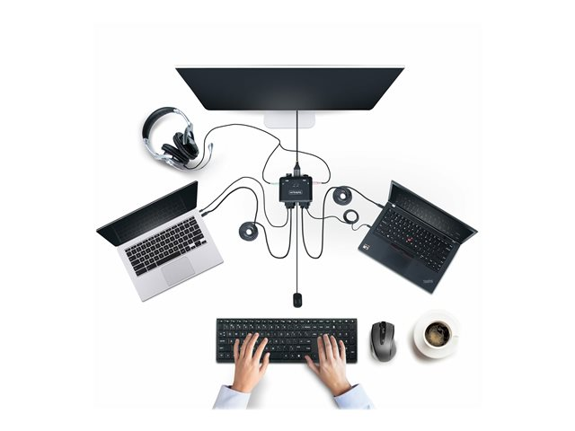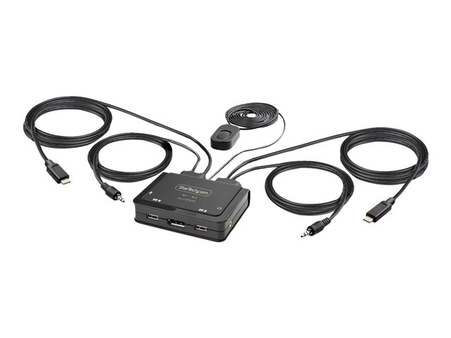Produktbeskrivning StarTech.com 2-Port USB-C Cable KVM Switch, 4K 60Hz DisplayPort Output, Compact KVM with 4ft/1.2m USB Type-C/Audio Integrated Cables, Bus Powered - Remote Push-Button/Hotkey Switching (C2-D46-UC2-CBL-KVM) - omkopplare för tangentbord/video/mus/ljud - kompakt - 2 portar Typ av enhet Omkopplare för tangentbord/video/mus/ljud - 2 portar Undertyp KVM Portar 2 x KVM/ljud Antal KVM-användare 1 lokal användare Funktioner Drivs via USB, fjärromkopplare, DisplayPort alternativt läge Dimensioner (BxDxH) 9.7 cm x 8.3 cm x 2.5 cm Vikt 350 g Färg Svart Systemkrav Microsoft Windows 7 / 8 / 8.1 / 10 / 11, Apple macOS 10.12 - 10.15, Apple macOS 11.0, Apple macOS 12.0, Google Chrome OS Tillverkarens garanti 2 års garanti -
