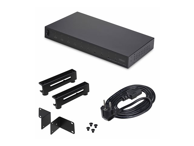 Produktbeskrivning StarTech.com - hubb - 10 portar - rackmonterbar Typ av enhet Hubb - 10 portar Modell Rackmonterbar Undertyp USB Portar 10 x USB-C Funktioner Överspänningsskydd, kortslutningsskydd, Snabbladdningsport Standarder som följs USB-IF-CERTIFIERAD Lokalisering Europa -