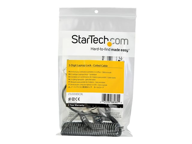 Produktbeskrivning StarTech.com 6ft (1.8m) Self-Coiling Laptop Cable Lock, Portable 3-Digit Combination Security Cable Lock for K-Slot Laptop/Computer/Desktop/Device, Coiled Anti-Theft Steel Cable Combo Lock - 6 ft Coiled Cable Lock (LTLOCK3DCOIL) - lås för säkerhetskabel Produkttyp Lås för säkerhetskabel Produktmaterial Vinyl, stål Dimensioner (BxDxH) 1.3 cm 2.03 cm Längd 1.8 m Vikt 118 g Egenskaper Återställningsbar funktion Tillverkarens garanti 2 års garanti -