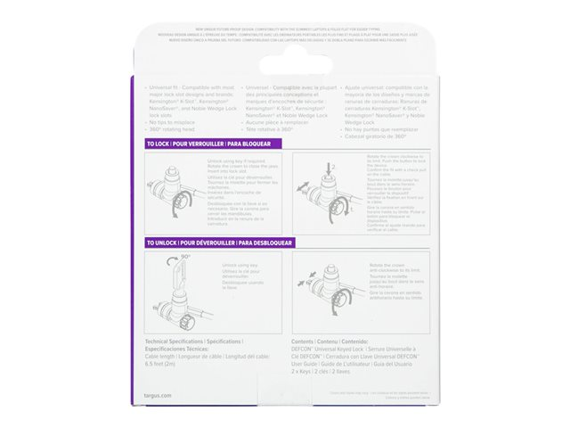 Produktbeskrivning Targus DEFCON Ultimate - lås för säkerhetskabel - universell nyckel med anpassningsbart låshuvud Produkttyp Lås för säkerhetskabel - universell nyckel med anpassningsbart låshuvud Färg Silver Produktmaterial Galvaniserat stål Dimensioner (BxDxH) 3.3 cm x 1.5 cm x 3.13 cm Längd 2 m Vikt 130 g Egenskaper 360 graders huvudrotation, skärresistent Tillverkarens garanti 2 års garanti -