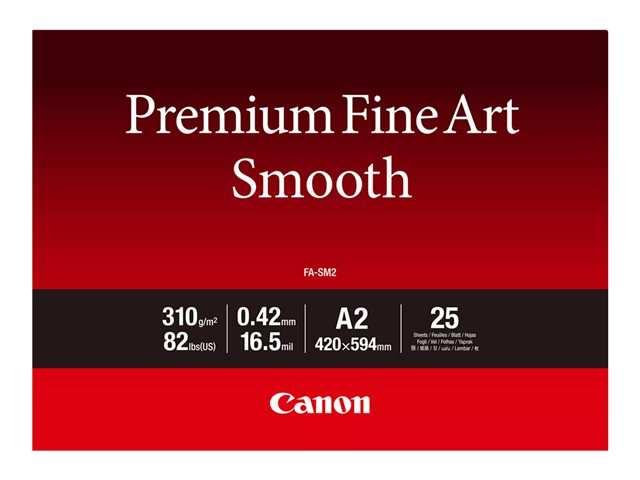 Produktbeskrivning Canon Premium Fine Art FA-SM2 - fotopapper - slät - 25 ark - A2 - 310 g/m² Typ av produkt Fotopapper Ytbeläggning Slät Mediastorlek A2 (420 x 594 mm) Utskriftsteknik Bläckstråle Medievikt 310 g/m² / 82 pounds Tjocklek på medier 16,5 mil Medföljande antal 25 ark Kompatibel med imagePROGRAF PRO-1000 -