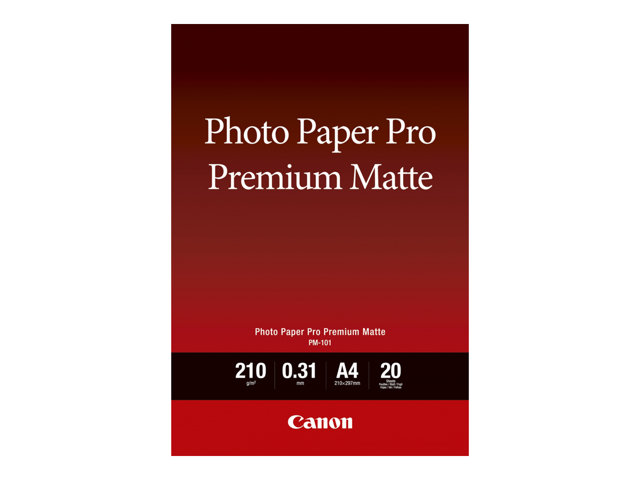 Produktbeskrivning Canon Pro Premium PM-101 - fotopapper - slät matt - 20 ark - A4 - 210 g/m² Typ av produkt Fotopapper Ytbeläggning Slät matt Mediastorlek A4 (210 x 297 mm) Medievikt 210 g/m² Tjocklek på medier 310 mikrometer Ljusstyrka på medier 92 Medföljande antal 20 ark Kompatibel med PIXMA PRO-1, PRO-10, PRO-100 -