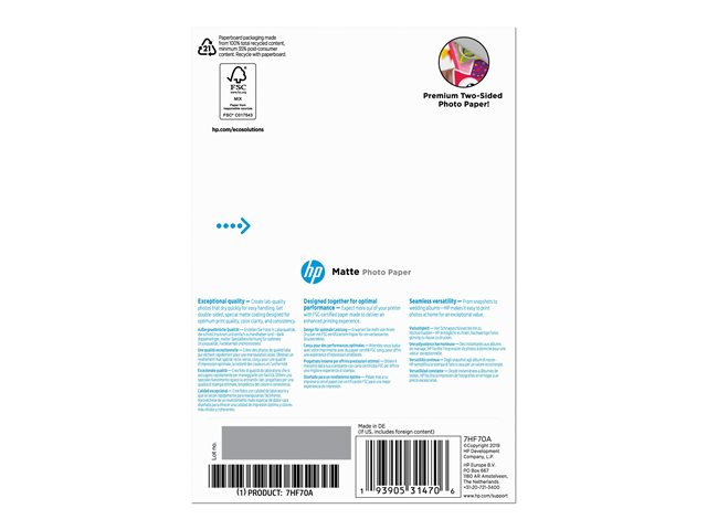 Produktbeskrivning HP - fotopapper - matt - 25 ark - 100 x 150 mm - 180 g/m² Typ av produkt Fotopapper Ytbeläggning Matt Mediastorlek 100 x 150 mm Utskriftsteknik Bläckstråle Medievikt 180 g/m² Tjocklek på medier 8,8 mil Medföljande antal 25 ark Tillverkarens garanti 1 års garanti Kompatibel med Deskjet 1000 J110, 10XX, 11XX, Ink Advantage 1015, Ink Advantage 1115, Ink Advantage 1275, Ultra Ink Advantage 2029; Officejet 100 L411, 150, 20X, 25X, 26XX, 38XX, 4500 G510, 45XX, 46XX, 52XX, 57XX, 6000, 6000 E609, 61XX, 6500 E709, 6500A E710, 68XX, 69XX, 7000 E809, 75XX, 76XX, 80XX, 8702, 9012 -
