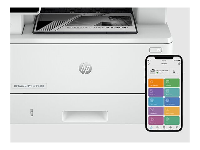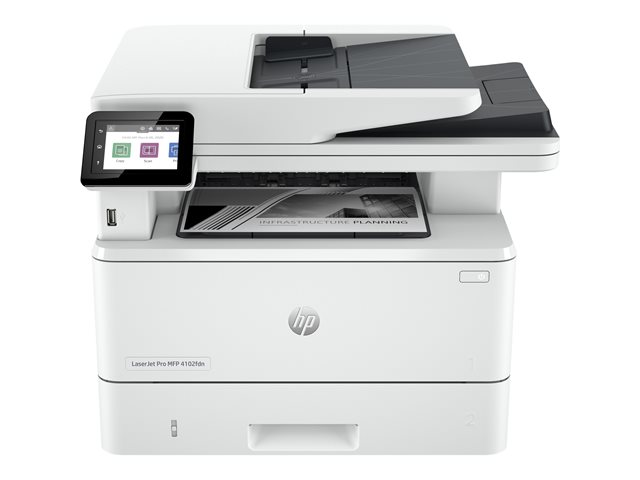Produktbeskrivning HP LaserJet Pro MFP 4102fdn - multifunktionsskrivare - svartvit Typ av enhet Multifunktionsskrivare Faxtyp Vanligt papper Lokalisering Engelska, tyska, franska, italienska, spanska / Europa Utskriftsteknik Laser (monokrom) Driftscykel per månad (max) 80000 sidor Rekommenderad månatlig volym 750 - 4 000 sidor Max kopieringshastighet Upp till 38 sidor/minut Max kopieringsupplösning Upp till 600 x 600 dpi Max utskriftshastighet Upp till 40 sidor/minut Max utskriftsupplösning Upp till 4800 x 600 dpi Max faxöverföringshastighet 33.6 Kbps Faxupplösningar 203 x 196 dpi, 300 x 300 dpi, 203 x 98 dpi Skanning 1200 x 1200 dpi Display 2.7" Originalstorlek Legal (216 x 356 mm) (max) Originaltyp Ark Dokumentmatarens kapacitet 50 ark Mediastorlek Legal (216 x 356 mm), A4 (210 x 297 mm) (max) Mediatyp Kuvert, brevkort, vanligt papper, lätt papper, tjockt papper, bond paper, färgat papper, brevpapper, förtryckt papper, förstansat papper, returpapper, etiketter Standard mediekapacitet 350 ark Max mediekapacitet 900 ark Utmatningsfackens kapacitet 150 ark Automatisk duplex Ja (kopiering) Ja (utskrift) Ja (skannar) Gränssnitt Gigabit LAN, USB, USB-värd, USB 2.0 AirPrint-aktiverad Ja Kontorsmaskinfunktioner HP Auto-On/Auto-Off Technology, Instant-on-teknologi, N-upputskrift, EKO-läge, HP Instant Ink, JetIntelligence Cartridge Technology, Mopria-certifierad, utskrift från mobila enheter, skanna till e-post, skanna till PDF, skanna till USB-värd, skanna till mapp, skanna till moln, Personligt tryck Strömtillförsel AC 230 V (50/60Hz) Dimensioner (BxDxH) 42 cm x 39 cm x 32.3 cm Vikt 12.6 kg Miljöstandarder ENERGY STAR-godkänd, Blue Angel Tillverkarens garanti 1 års garanti -