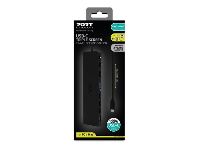 Produktbeskrivning PORT connect TRIPLE SCREEN TRAVEL - dockningsstation - USB-C 3.1 Gen 2 - DP, HDMI, VGA - 1GbE Typ av produkt Dockningsstation Dockningsgränssnitt USB-C 3.1 Gen 2 Videogränssnitt DP, HDMI, VGA Dimensioner (BxDxH) 20.7 cm x 5.8 cm x 1.7 cm Vikt 200 g Nätverk Gigabit Ethernet Tillverkarens garanti 3 års garanti -