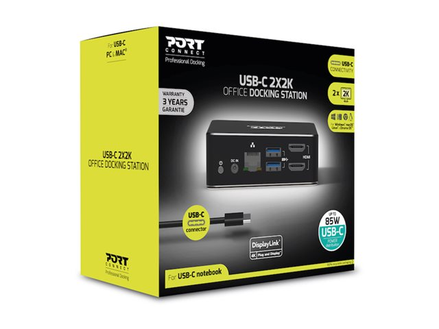 Produktbeskrivning PORT connect USB-C & USB-A Dual Video Docking Station 2 X 2K - dockningsstation - USB-C / USB 3.0 - 2 x HDMI - 1GbE Typ av produkt Dockningsstation Dockningsgränssnitt USB-C / USB 3.0 Videogränssnitt 2 x HDMI Dimensioner (BxDxH) 9.5 cm x 9.5 cm x 3.3 cm Vikt 180 g Färg Svart Nätverk Gigabit Ethernet Strömtillförsel Strömadapter 100 Watt Effekt Tillverkarens garanti 3 års garanti -