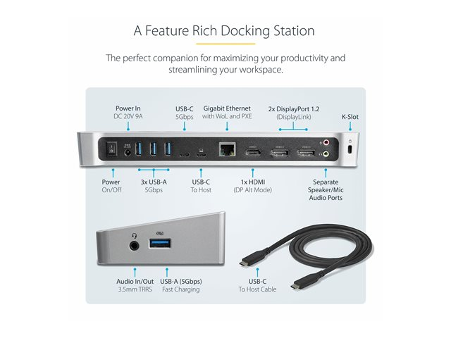 StarTech.com 4K USB-C-docka för tre skärmar med 5 USB 3.0-portar