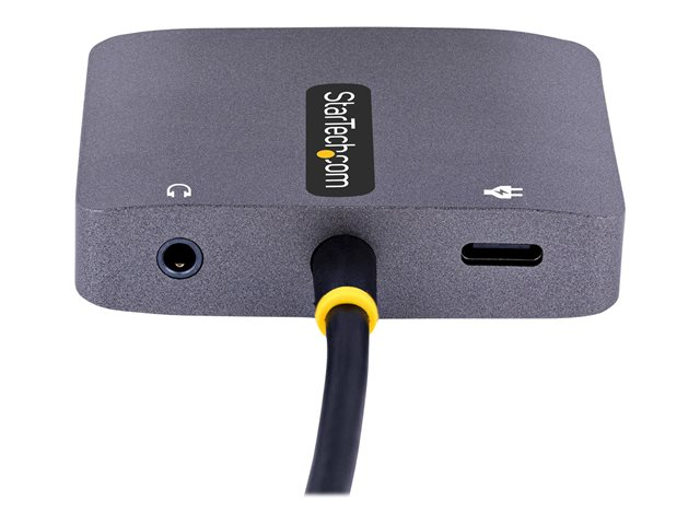 Produktbeskrivning StarTech.com USB C Video Adapter, USB C to HDMI VGA Multiport Adapter w/ 3.5mm Audio Output, 4K 60Hz, HDR, 100W PD 3.0, USB C Monitor Adapter for Laptop, Thunderbolt 3/4 Compatible - USB C Display Travel Adapter (122-USBC-HDMI-4K-VGA) - dockningsstation - USB-C / Thunderbolt 3 / Thunderbolt 4 - HDMI, VGA Typ av produkt Dockningsstation Dockningsgränssnitt USB-C / Thunderbolt 3 / Thunderbolt 4 Videogränssnitt HDMI, VGA Dimensioner (BxDxH) 6 cm x 4.5 cm x 1.4 cm Vikt 41 g Färg Grå Tillverkarens garanti 3 års garanti -