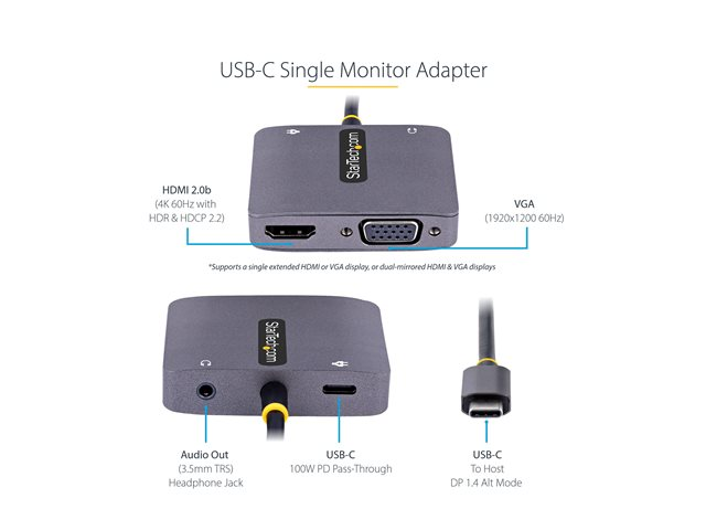 StarTech.com USB C Video Adapter, USB C to HDMI VGA Multiport Adapter w/ 3.5mm Audio Output, 4K 60Hz, HDR, 100W PD 3.0, USB C Monitor Adapter for Laptop, Thunderbolt 3/4 Compatible