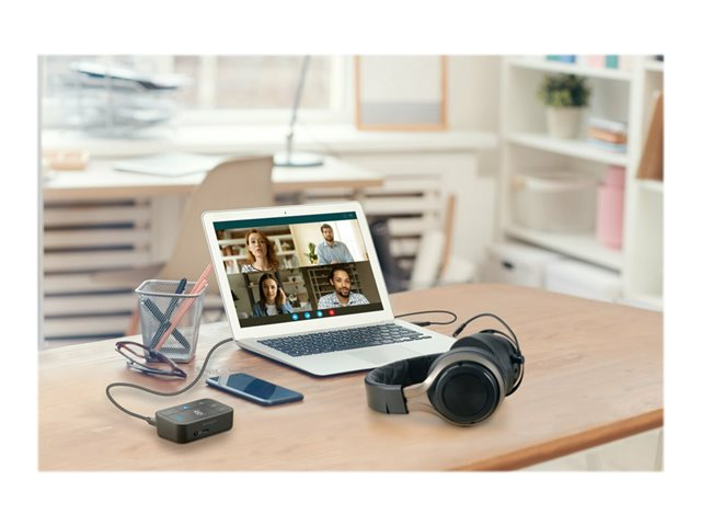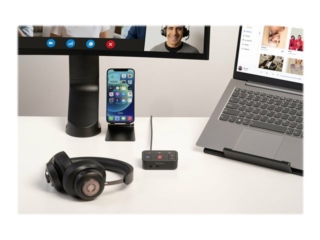 Produktbeskrivning Kensington Universal 3-in-1 Pro Audio Headset Switch - headset-omkopplare för headset Typ av produkt Headset-omkopplare Avsedd för Headset Trådlöst gränssnitt Bluetooth Förpacknings innehåll USB-C till USB-A-adapter, USB-C till USB-A-kabel (2 m) Produktmaterial PC/ABS Dimensioner (BxDxH) 8.3 cm x 2.7 cm x 5.3 cm Vikt 85 g Färg Pantonesvart C Kompatibel programvara Cisco WebEx, Microsoft Teams, Zoom, Google Meet Tillverkarens garanti 2 års garanti -