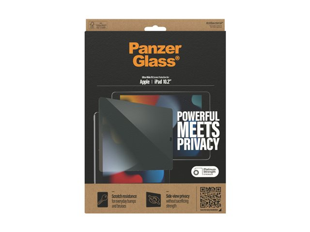 Produktbeskrivning PanzerGlass Privacy & Case Friendly - skärmskydd för surfplatta Typ av produkt Skärmskydd - glas Avsedd för Surfplatta Kompatibel skärmstorlek 10.2" Skydd Stötsäker, reptålig, stötskydd, okrossbar, fingeravtrycksresistent, antimikrobisk, bländskydd Produktmaterial Härdat glas, oleofobisk beläggning Designat för Apple 10.2-inch iPad (7:e generation, 8:e generation, 9:e generation) -