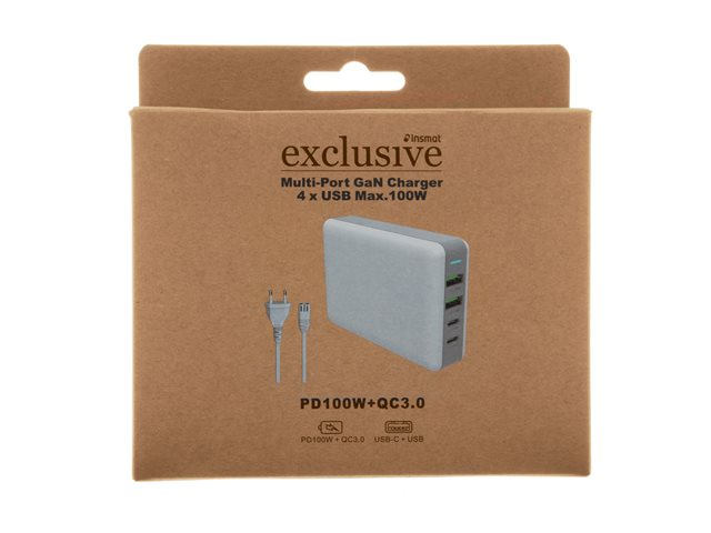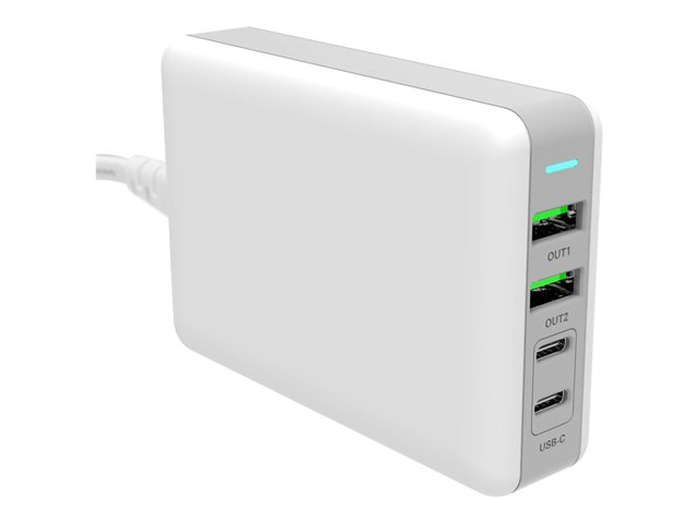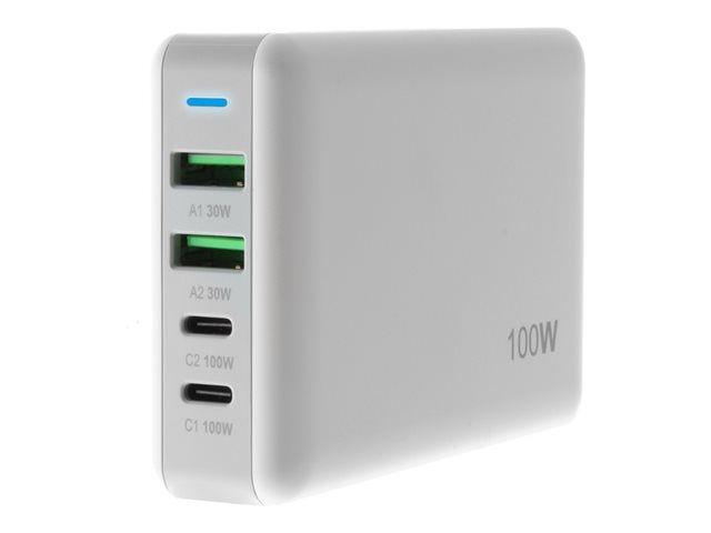 GaN - 100 Watt - 5 A - PD 3.0, QC 3.0 - 4 utdatakontakter (2 x 9-stifts USB typ A, 2 x USB-C) - vit