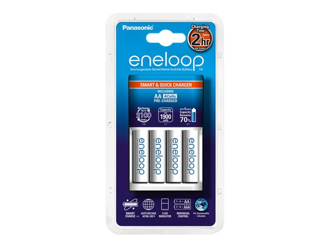 Produktbeskrivning Panasonic Eneloop Smart & Quick batteriladdare - 4 x AA-typ - NiMH Typ av produkt Batteriladdare (för 4xAA/AAA) Nätspänning AC 100-240 V Batteri AA-typ - nickelmetallhydrid - 1900 mAh Inkluderade batterier 4 delar -