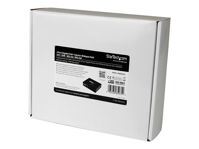 Produktbeskrivning StarTech.com Gigabit-midspan med 4 portar - PoE+-injektor - 802.3at/af - strömtillförsel - 120 Watt Typ av enhet Strömtillförsel - extern PoE (Power Over Ethernet) PoE+ Vikt 220 g Inspänning AC 100-240 V Effektkapacitet 120 Watt Färg Svart Dimensioner (BxDxH) 9.7 cm x 7 cm x 2.6 cm Tillverkarens garanti 2 års garanti Designat för P/N: POEEXT1GAT, POEEXT2GAT, ST12MHDLANU -